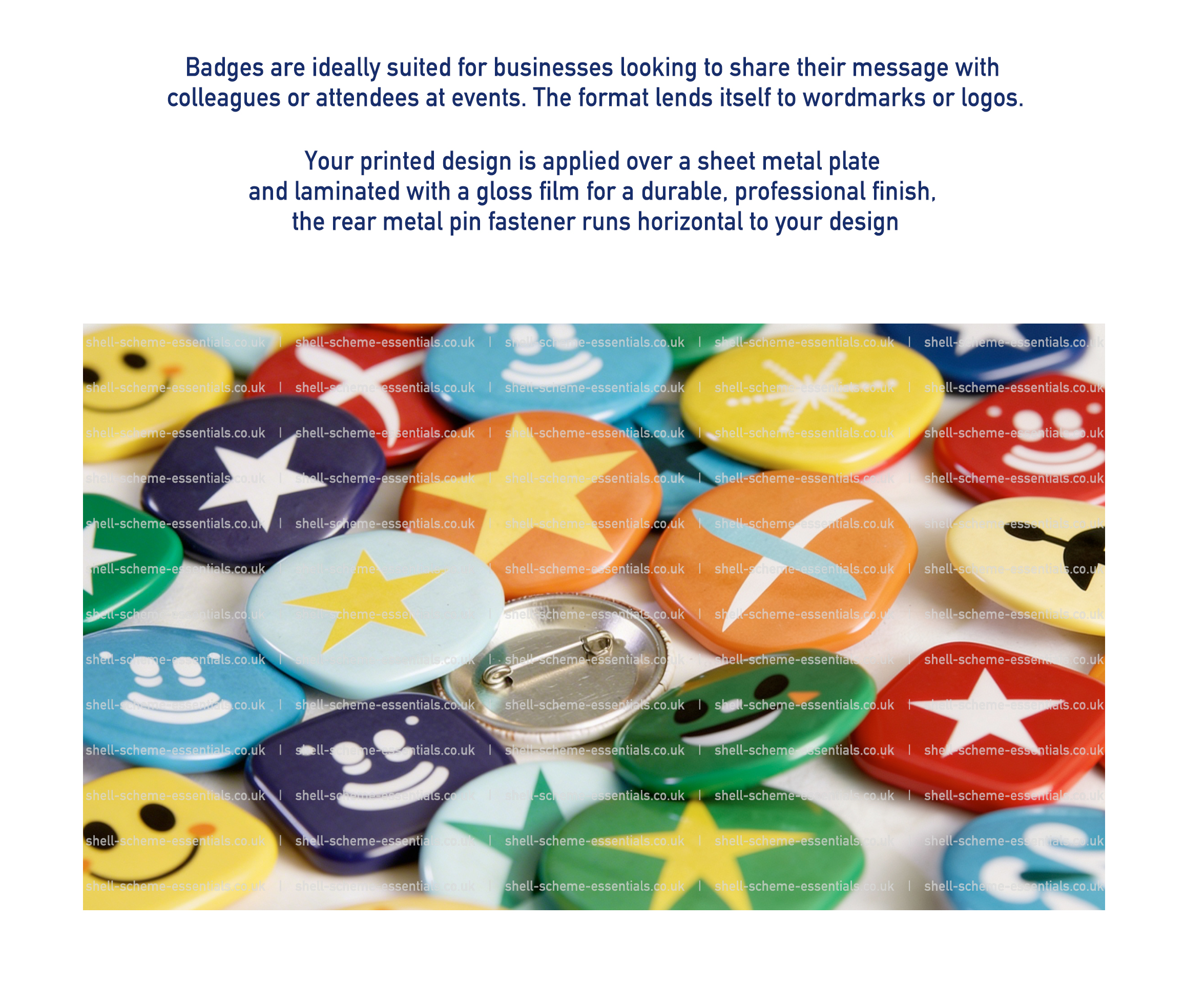 Printed in full colour and mounted onto a metal backing, these Button Badges are laminated with a gloss film to complete your look. The metal pin fastener runs horizontal to your design.