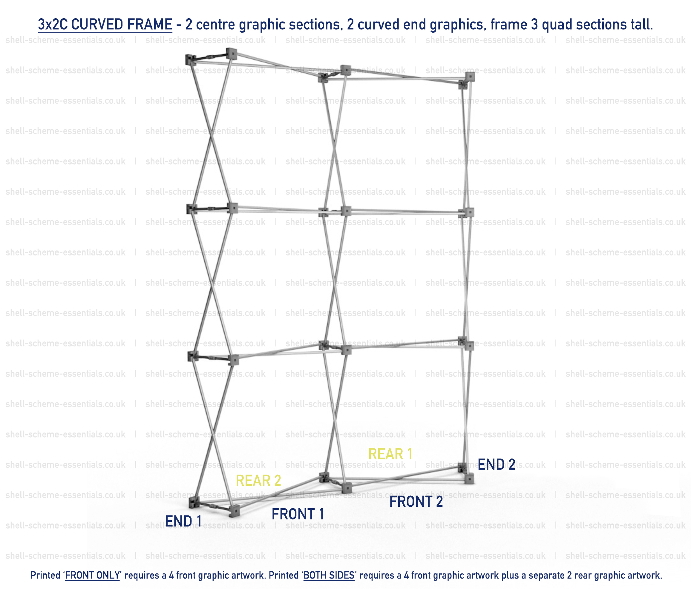 3×2 Impact hardware displays 2 front graphics plus 2 curved end of frame graphics (budget hardware includes; 3x2C popup frame bag, the required mag bars, mag bar bag, graphic headers and kickers plus either 4 or 6 high-quality, printed vibrant graphics, depending on your chosen graphic selection – stand lights & transport case excluded).