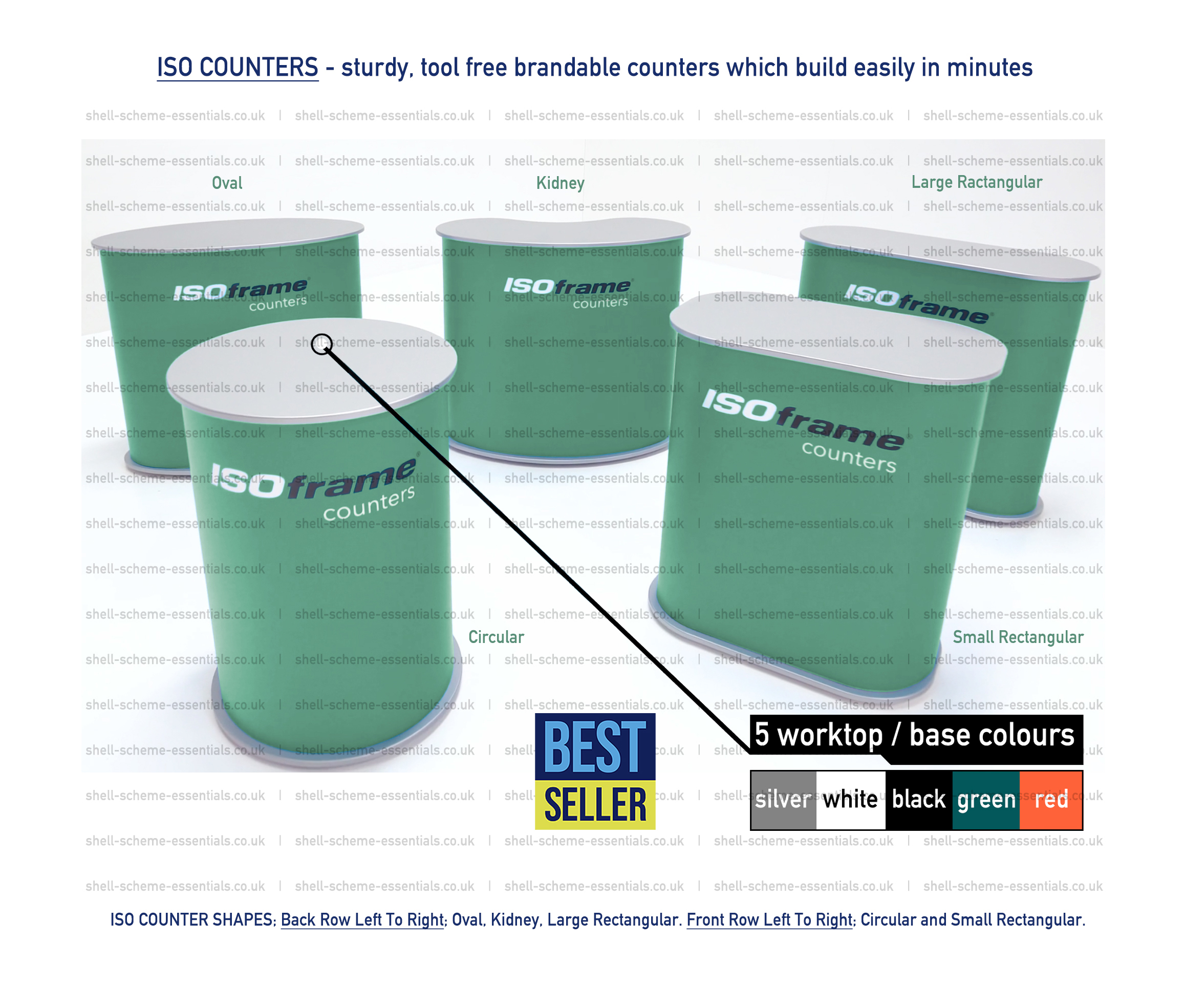 ISO exhibition counters ship with no internal shelf and no cable port in the worktop as standard.